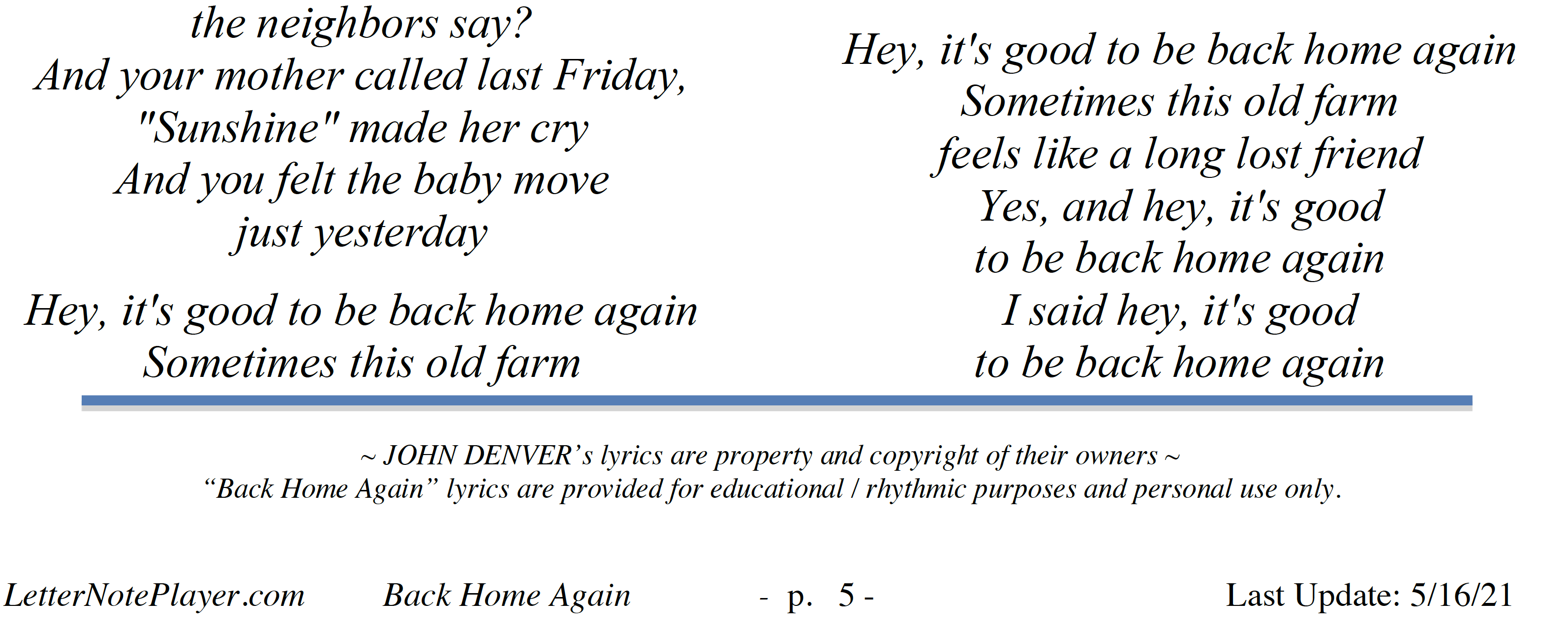 Love Song Lyrics For Back Home Again John Denver With Chords